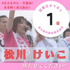 いよいよ、9月24日の投票日まであと1日となりました。 本日まで、皆様の真心とご支援、ご声援に支えられ、感謝申し上げます。 松川けいこ、まだまだ東大阪市で、皆様とともに、皆様の笑顔と安心のために、走らせてください。働かせ […]
