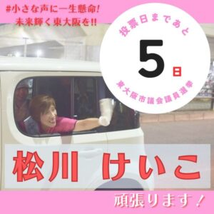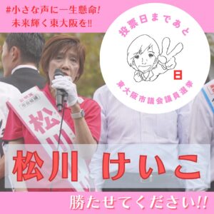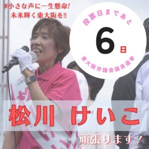 いよいよ残り2日となりました。 大変厳しい選挙戦。 最終盤、松川けいこ皆様のもとへ足を運び、ご挨拶させていただいております! 大切な一票、松川けいこに託してください!! 小さな声に一生懸命、皆様のお声を必ず形にしてまいり […]