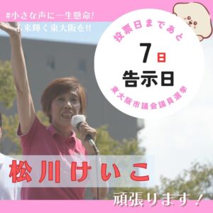 ◇投票日まで、あと7日‼️◇ 本日、告示を迎えいよいよ選挙戦が始まりました。 皆様の大切な1票を決して無駄にはいたしません。 どうか、松川けいこに皆様の絶大なご支援を賜りますよう、よろしくお願いいたします。 「小さな声に […]
