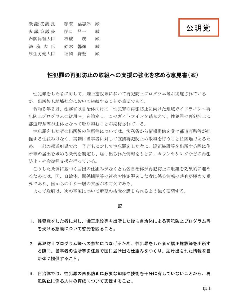 特に性犯罪の再犯防止については、先に行なわれた大阪市議会など、おおさか維新の会が過半数を占める議会でも同様の文章、内容で全会派賛成可決。