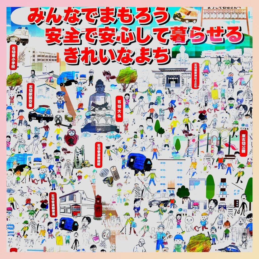 「みんなでまもろう安全で・安心して暮らせる・きれいなまち」をテーマにした石切東小学校生徒と石切中学校美術部とのコラボ作品の防犯啓発ポスターです。