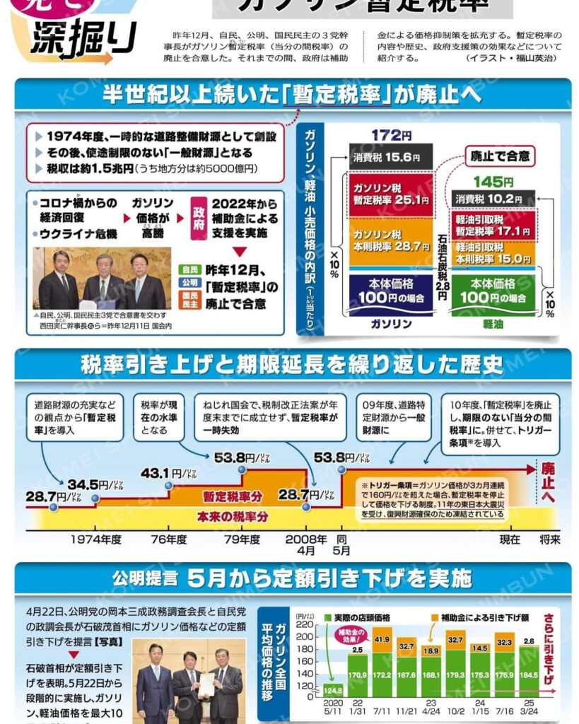 4月25日 ガソリン暫定税率が廃止へ 2025年4月26日 最終更新日時 : 2025年4月26日 Matsukawa 今日の公明新聞から 多くの方から反響をいただきました。 公明党、自民党、国民民主党の3党幹事長合意でガソリン暫定税率が廃止へ。 それまでの期間、定額の補助金で価格抑制策の拡充を実施。