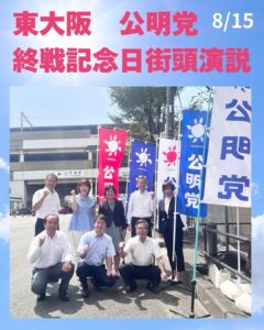終戦記念日の8月15日、東大阪総支部議員団で平和への誓いを込めて記念街頭を行いました。 終戦から80年の節目にあたり、公明党は本年5月「平和創出ビジョン」を発表しました。 国民の多くが悲惨な戦争の経験がなく、記録の中の戦 […]