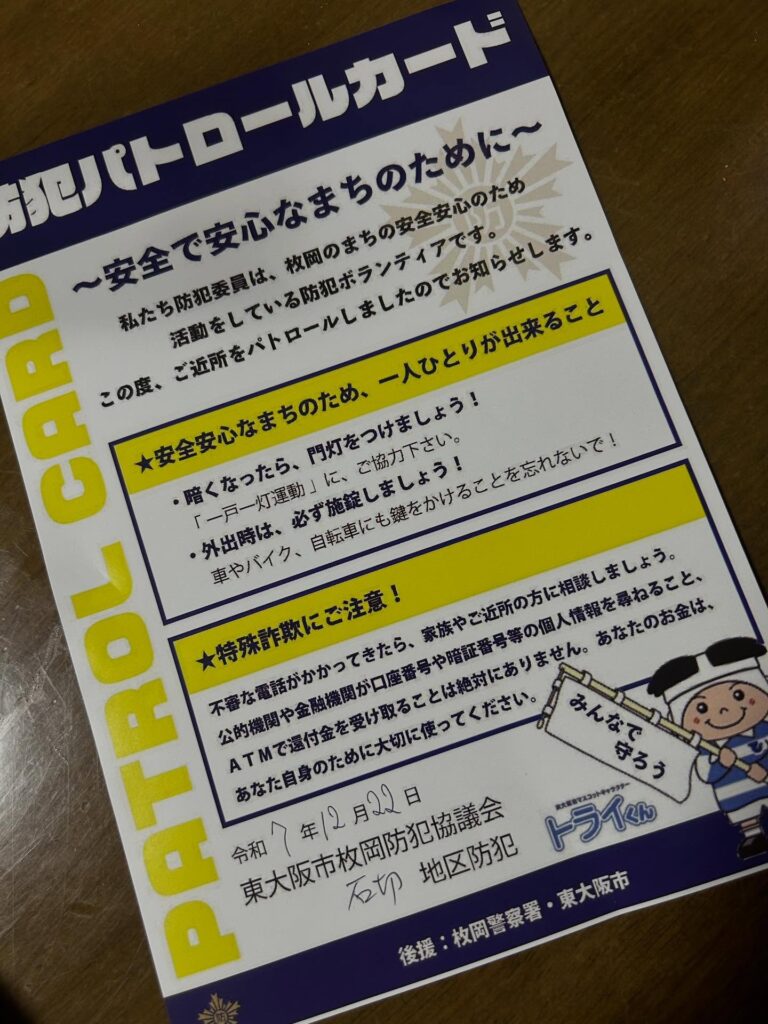 12月22日 年末の夜警が始まっています 2025年12月23日 最終更新日時 : 2025年12月23日 Matsukawa 年末の夜警が始まっています。 昨日は石切東防犯の出陣式、今夜は石切防犯の方のパトロールカードがポストに入っていました。 寒い中での活動に心から感謝致します。 年末年始、皆様くれぐれもお気をつけてお過ごしください。